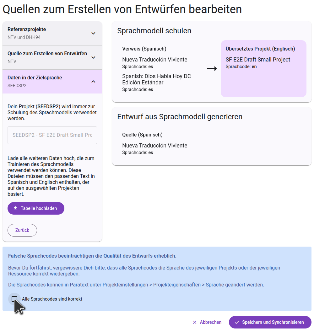 Im letzten Schritt werden die Daten in der Zielsprache angezeigt. Dazu gehört immer auch Dein Projekt selbst, das bereits ausgewählt ist und nicht entfernt werden kann. Du kannst in diesem Schritt zusätzliche Schulungsdaten hinzufügen, indem Du ein Arbeitsblatt mit gepaarten Daten hochlädst, wobei die Ausgangssprache in der ersten Spalte und die Zielsprache in der zweiten Spalte steht.