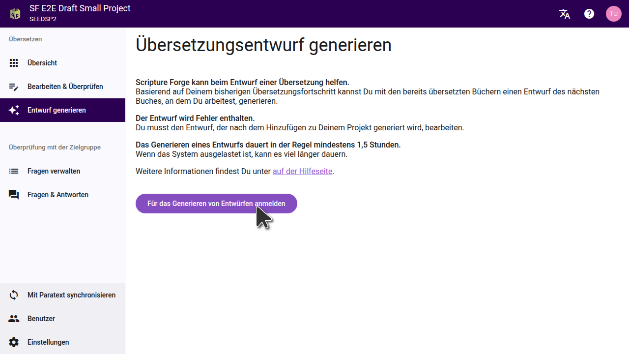 Um einen Entwurf in Scripture Forge zu regeistrieren, klicke auf die Schaltfläche "Entwurf generieren" im Hauptmenu. Klicke dann auf "Für Übersetzungsentwurf generieren anmelden" und fülle das Formular aus, das erscheint, um Deinem Projekt den Zugang zu ermöglichen. Rückübersetzungsprojekte sind standardmäßig aktiviert. Das Formular muss dafür nicht ausgefüllt werden.