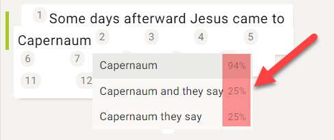 Cuando Scripture Forge le muestre sugerencias de traducción, puede utilizar las teclas de flecha arriba y abajo para resaltar la sugerencia que desee.