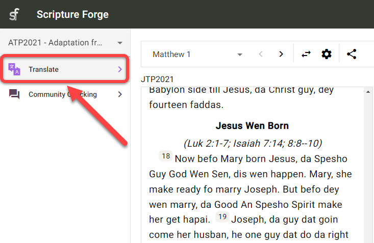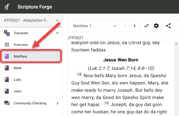 Haga clic en el panel de navegación de Scripture Forge: