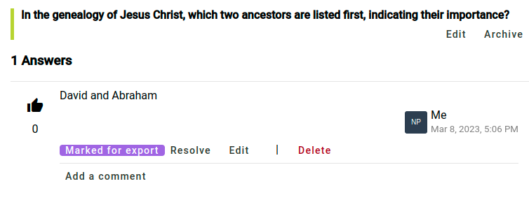 Pour afficher les réponses des vérificateurs de la communauté, cliquez sur l'un des livres dans la section Vérification par la communauté dans la barre latérale de navigation. Cliquez ensuite sur une question pour voir les réponses qui ont été données. Si vous souhaitez qu'une réponse soit exportée vers Paratext, cliquez sur Marquer pour l'exportation sur cette réponse. Si vous ne voulez rien faire d'autre avec la réponse, cliquez sur Résoudre. Cela ne supprime pas la réponse, mais la marque comme ne nécessitant pas d'autre action.