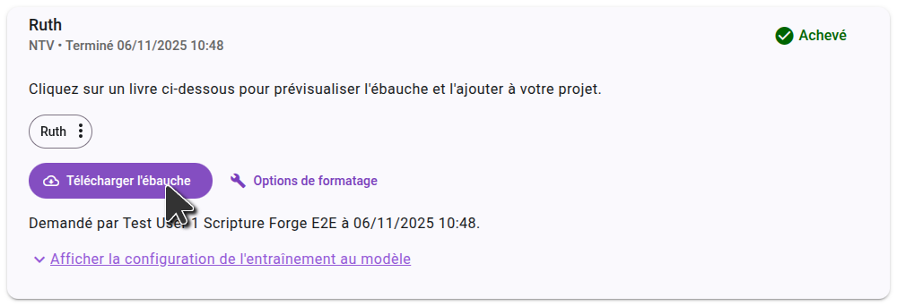 Lorsque votre ébauche est terminée, Scripture Forge vous indiquera qu'il est prêt et affichera la liste des livres qui ont été rédigés. Les ébauches générées ne sont pas automatiquement importés dans votre projet. Vous pouvez prévisualiser ou importer des ébauches depuis la page Générer ébauche.