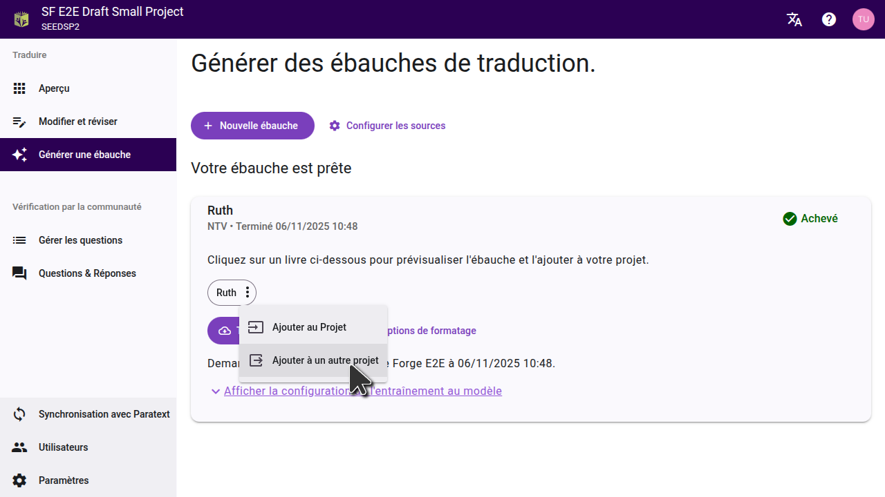 Si vous préférez ne pas importer l'ébauche directement dans votre projet, vous pouvez également télécharger l'ébauche sous forme de fichiers USFM. Dans la page "Générer l'ébauche ", cliquez sur "Télécharger l'ébauche ", et extrayez les fichiers sur votre ordinateur. Vous pouvez ensuite importer ces fichiers dans un projet dans Paratext.