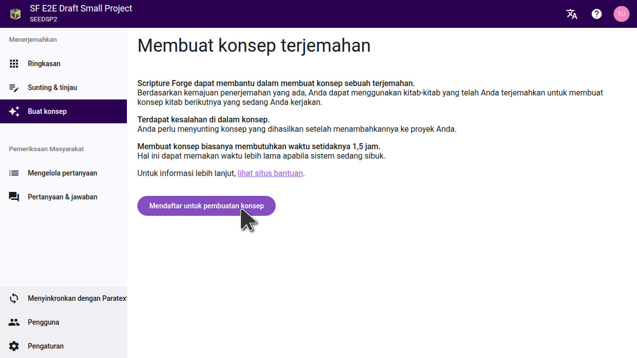 After you fill out the form, the Scripture Forge onboarding team will review your request and work to find the best settings for your project. You will be provided with one or more drafts to review. If you decide that generating drafts is right for your project, the team will enable drafting on your project and guide you through the process of selecting the settings that were found to be best.